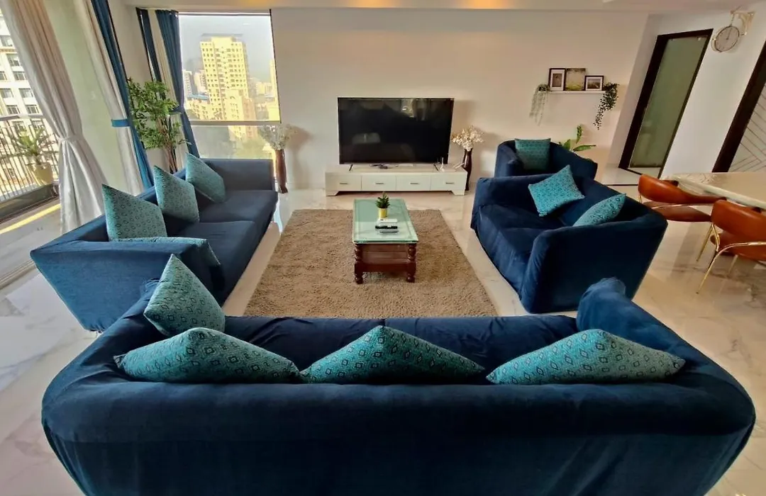 Sommige kamers van Premium Apartment In Hiranandani Powai By Maxxvalue - Chitranjan zijn voorzien van een zitruimte, een flatscreen TV met satellietzenders en airconditioning. Sommige kamers beschikken over een apart toilet en een douche.